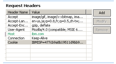 3. In the Test Element Details area, locate the Request Headers table, and double-click the cell containing a value that you want to edit.