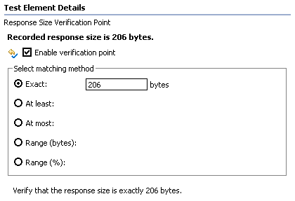 Response size verification points verify that the number of bytes returned in a response is what you expected. If the byte count does not match, the test log reports a failed verdict event. You can specify an exact response size or verify that the byte count is within a range.
