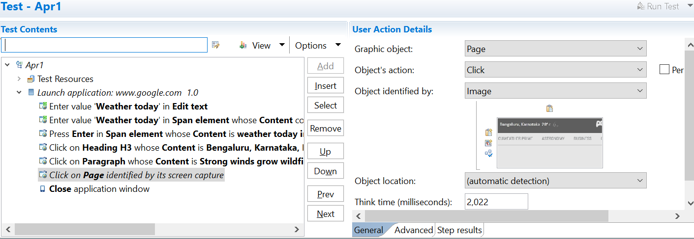 - In the Test Contents pane, click a test step that contains images or user interface elements. The related properties of the captured object are displayed in the Properties pane.