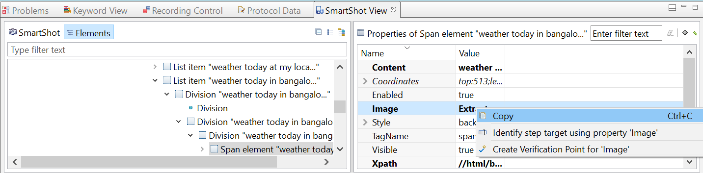 Option Description Copy Copies the image that is selected in the ScreenShot pane to the clipboard. Identify step target using property ‘Image’ Updates the test steps to recognize the target object during the playback by using the selected images. Note:The selected image can be changed by using the User Action Details pane.Create Verification Point for ‘Image’ Creates a verification point for the test step by using the image captured in the image property. -