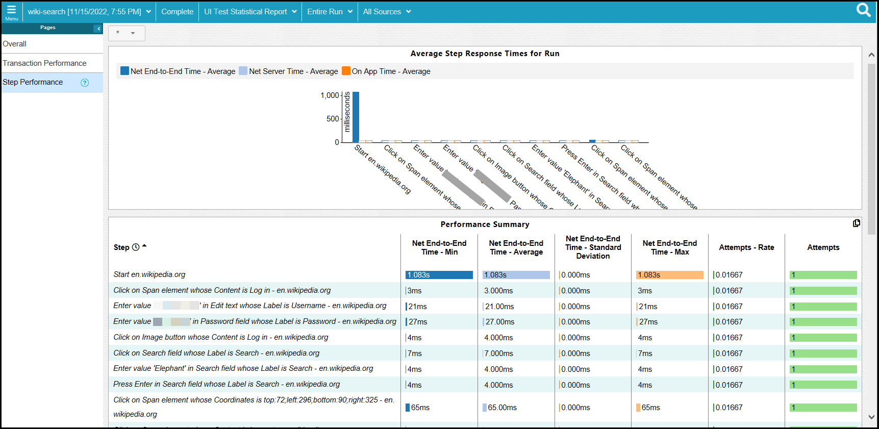 A few screen captures of the UI Test Statistical report that is generated for the test scenario of this tutorial are as follows: