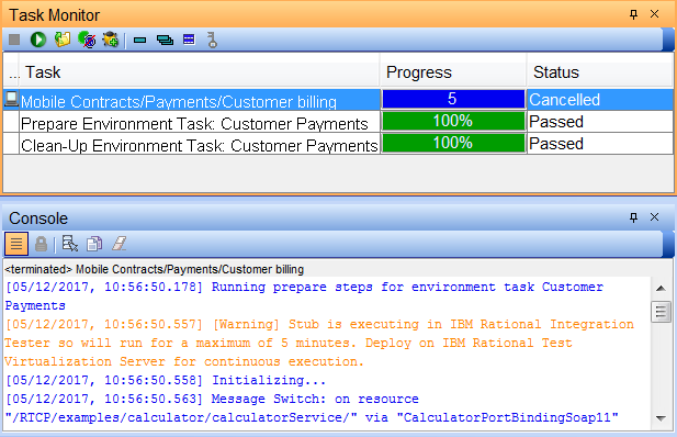 When using an environment task, a task is added to the parent resource (through stub or scenario properties) and the engine executes appropriate branches of the task at the right times. Hence, any actions defined in the Prepare Steps branch are executed before the parent resource, and those actions under the Clean-Up Steps are executed after the parent resource. When a task contains both prepare steps and clean-up steps, the engine executes them in sequence as appropriate. On executing the clean-up steps of an environment task, a new row is displayed in the Task Monitor the same way as for the prepare steps. The following screen shot shows a sample task execution: