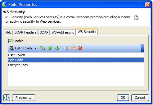 Security actions are created and modified under the WS-Security tab of the Field Properties window, which is opened when you are viewing the properties of a SOAP message (see WS-Security). One or more security actions can be created, and the inclusion of those actions can be enabled or disabled by selecting or clearing the Enabled check box on the WS-Security tab.