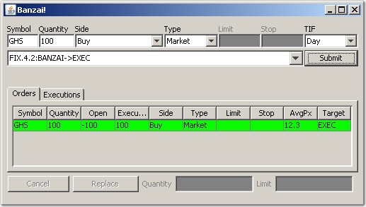 In Banzai, a trade is submitted by using the FIX 4.2 Session.