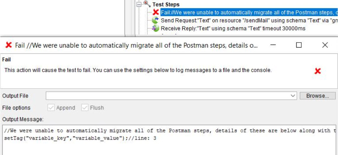 If certain Postman tests are not migrated to Test Integrations and APIs, you can find information about such tests displayed under a Fail action.