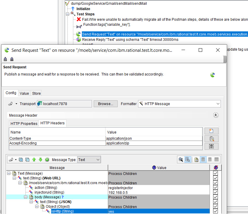 If the service endpoint was configured in Postman, then in the migrated resource the physical transport is created with the service endpoint as the host. For example, if the service endpoint was gmail.com, the physical transport is created with gmail.com as the host and you must configure the HTTP proxy in the transport for the request to be sent to the stub in Test Integrations and APIs.