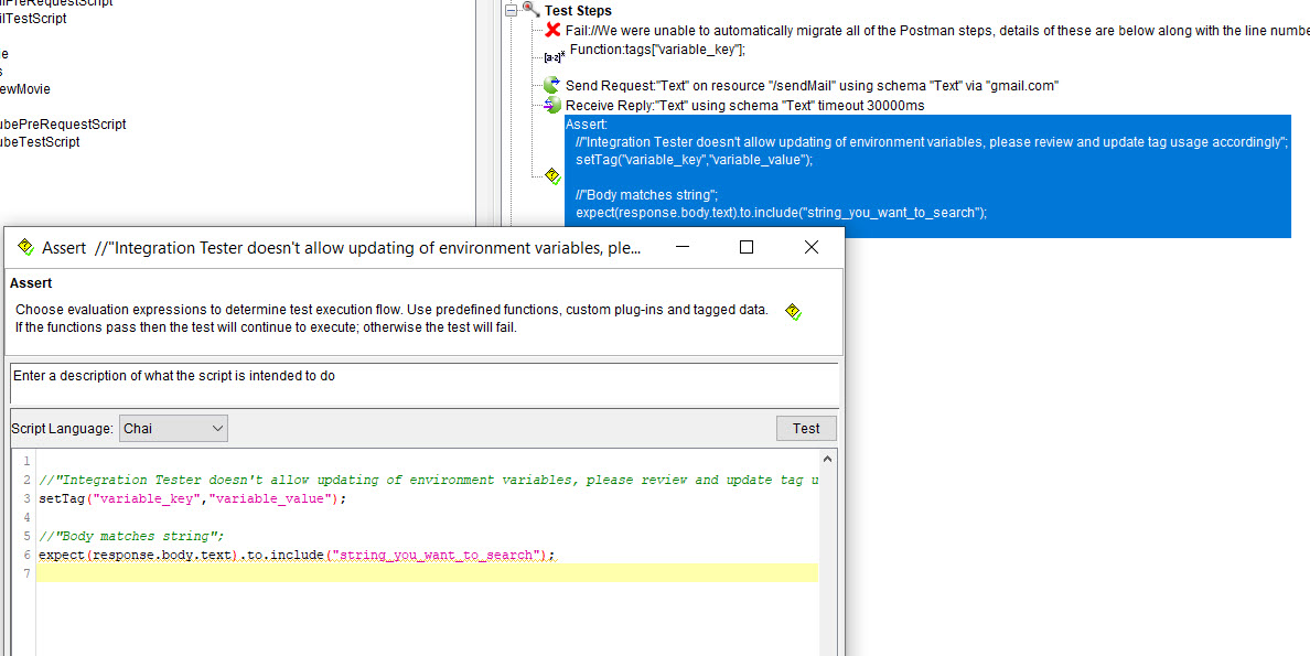 The tests in the Postman request are migrated as an Assert action in Test Integrations and APIs.