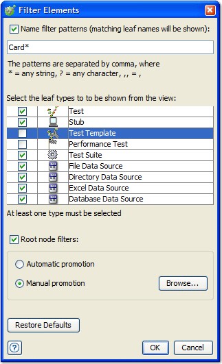 Finally, you can set manual root node filters by enabling the Root node filters option. Select the Manual promotion entry and click Browse to locate the node that you want to promote. The selected node appears as the root of the project in the component view.