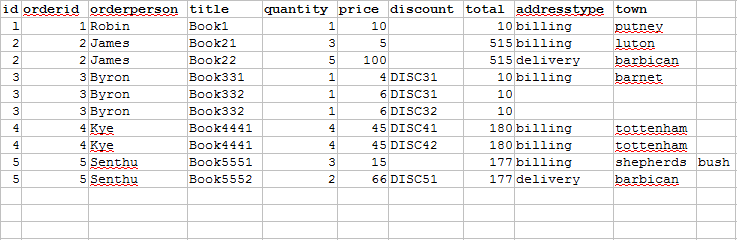 When the entire XML schema is matched against the following test data (which is in the form of an Excel data set), five orders can be obtained.