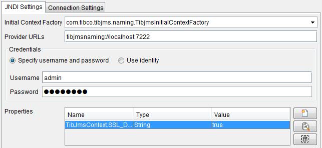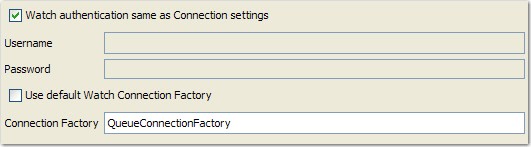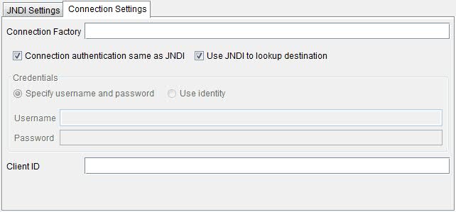 Connection authentication same as JNDI Enable this option to use the same user name and password for the connection factory as the user name and password for JNDI. If disabled, the Username and Password fields become active.