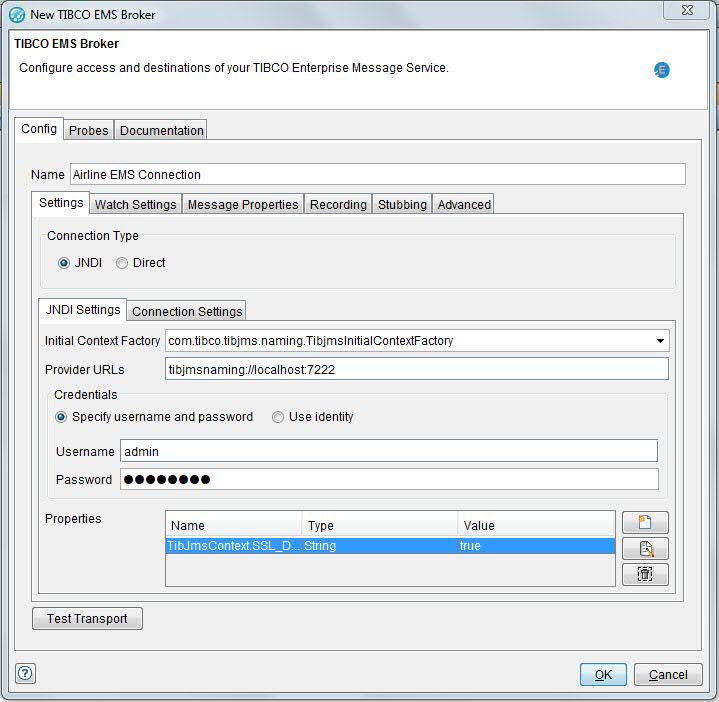The configuration of the EMS transport is divided among several different areas, including JNDI settings, Connection settings, Broker connection settings, Watch settings, Message properties, Recording mode and Stubbing mode, SSL settings, and Advanced settings.
