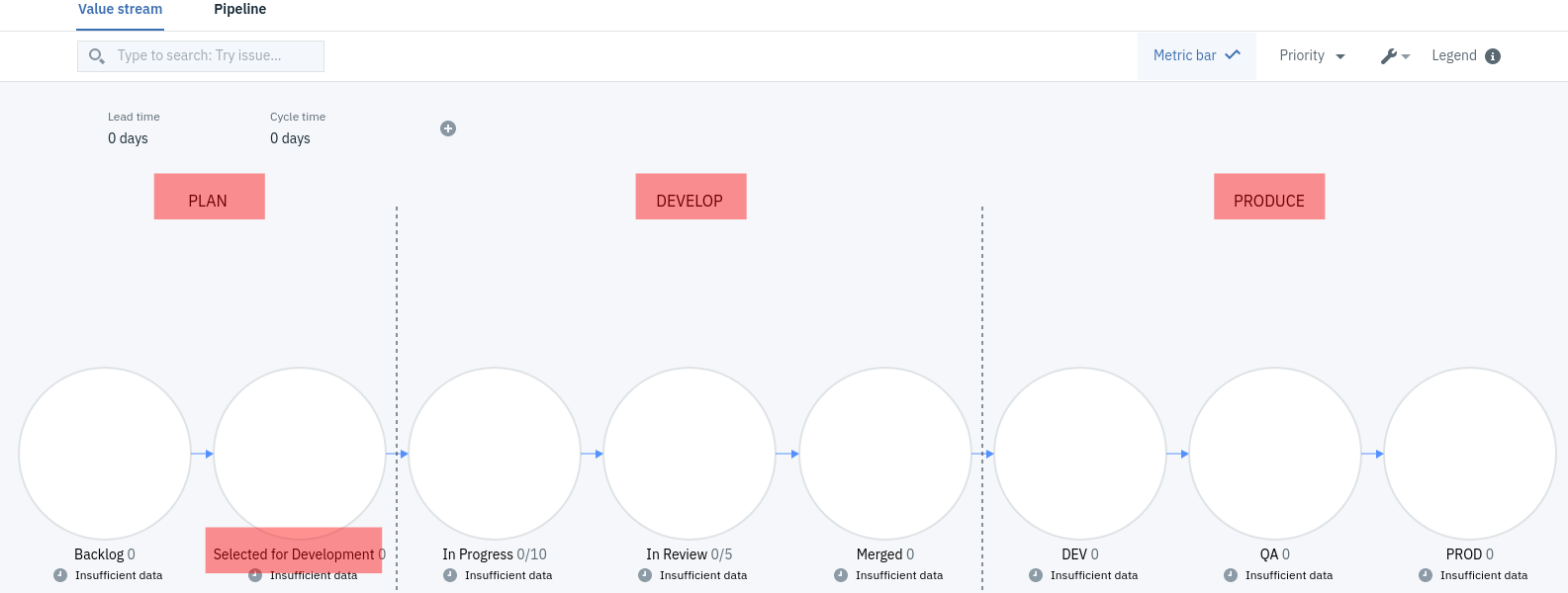 When you create a value stream, the first thing to identify is the phases. There are many ways to divide a workflow, of course. One approach is to start with the tools that your team uses. In the default value stream, the Planning phase is used for project management and issue tracking tools, such as Jira. The items created in this phase define the project, both its overall scope and its smallest details.