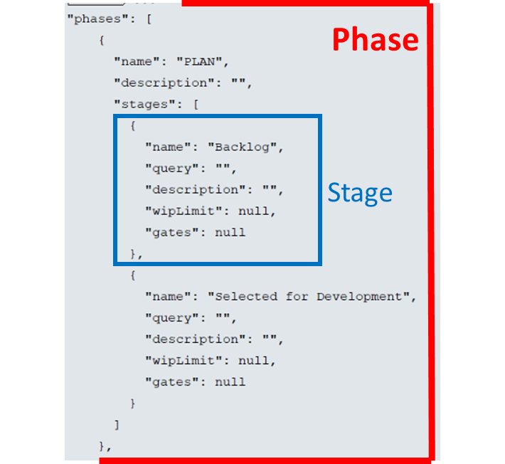 "phases"array. Each phase is defined by a separate array object. The default value stream phases arePlanning,Development, andDeployment. Each phase contains astagesarray where stages are defined. For example, the Planning phase contains theBacklogandQueuestages. -
