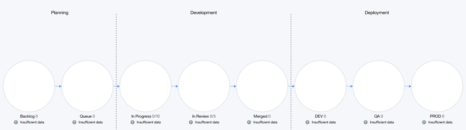 The following figure shows the default value stream workflow. Notice anything? The stages of the Planning and Development phases correspond to the statuses in the simplified Jira workflow. Jira-related dots can move through the value stream stages as they transition along the Jira workflow. You customize value streams to reflect the tools that you use in your development lifecycle.