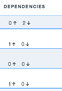 Task dependencies are shown in the DEPENDENCIES column on the Deployment Plan Detail page. Up arrows indicate task prerequisites; down arrows indicate task dependencies. In the following figure, the first task does not have any prerequisites and has two tasks dependent on it. The second task has one prerequisite task and there are no tasks dependent on it.