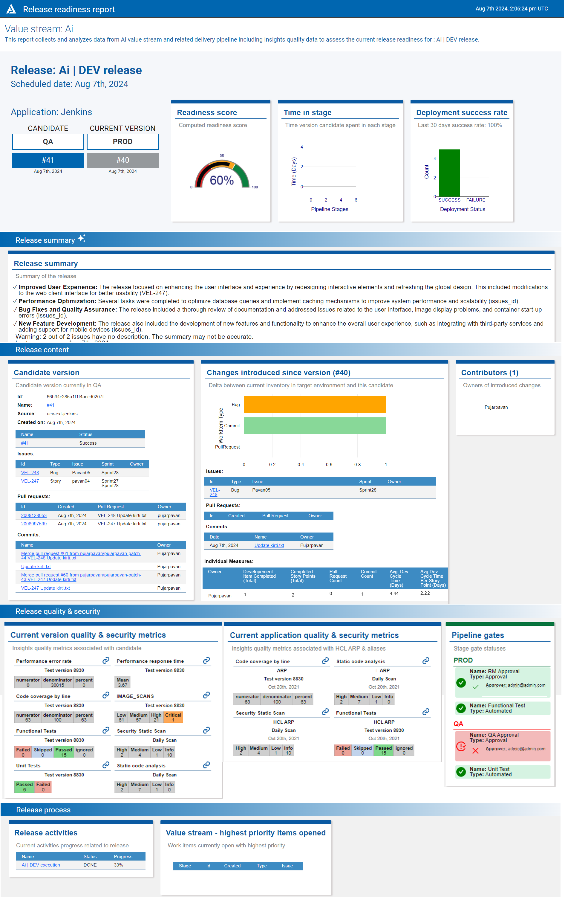 | Release quality & security | Approvals, Current version quality & security metrics, Current application quality & security metrics, Pipeline gates |