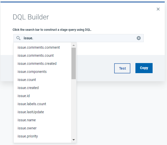 4. To create a query, click DQL Builder and then DQL Builder window appears. Type the query in search field and select the required one from the list to create query. After creating query, click Test to view results for the selected query. Click copy to copy the created query. You can use the copied query in JSON code or tree editor.