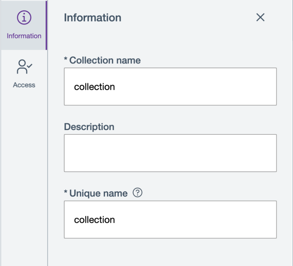 - Collection unique-name is an optional field. If it is not provided by the user, the system will generate a collection unique-name based on the collection name replacing all the URL reserved characters (e.g. "?!#$&%'*+/;:,=@()[]") with underscores.