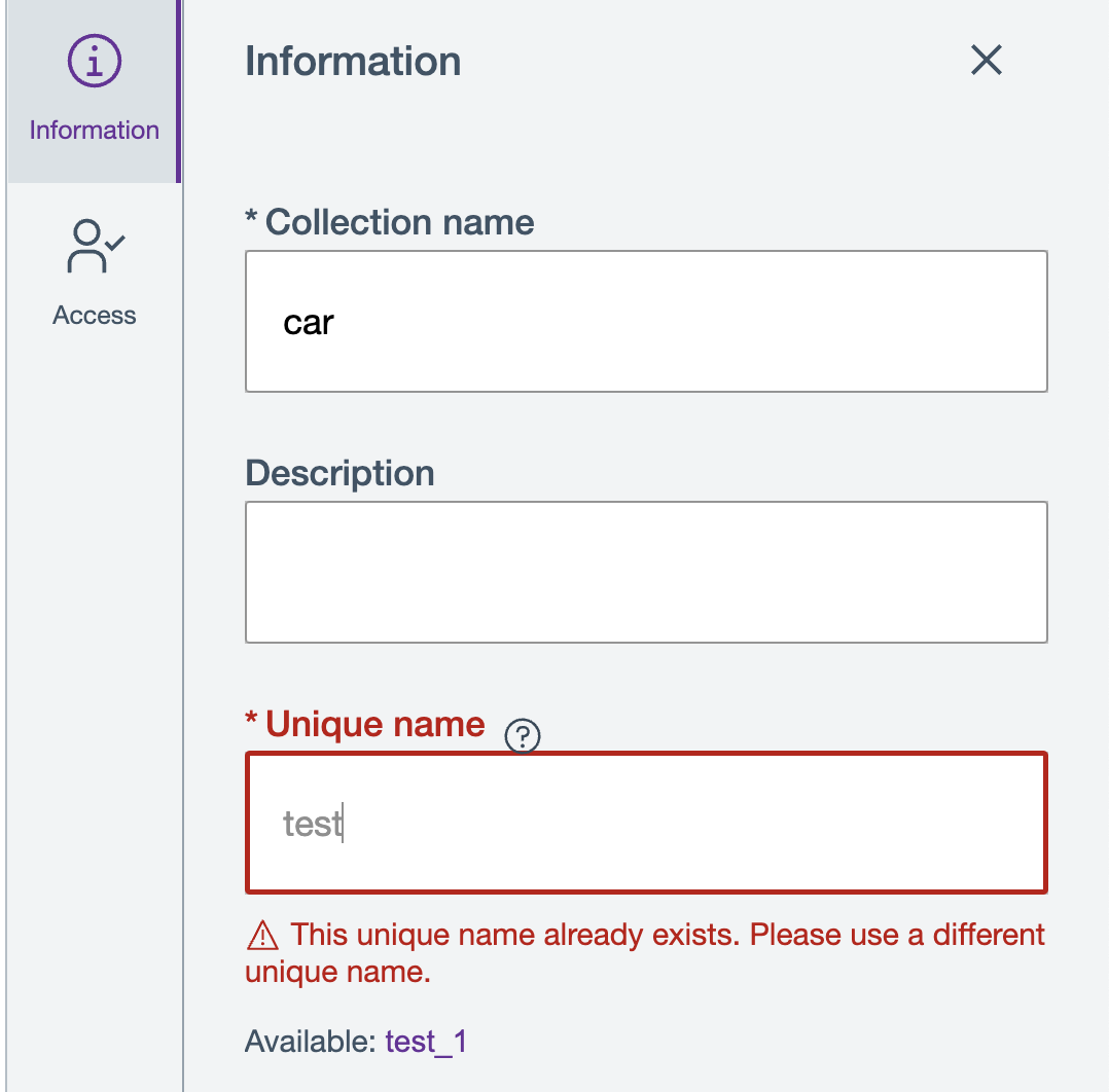 While creating or editing a collection, DAM checks for any duplication of the unique-name and prompts with an error message. It also suggests an available unique-name if a duplicate is found in any other collection.