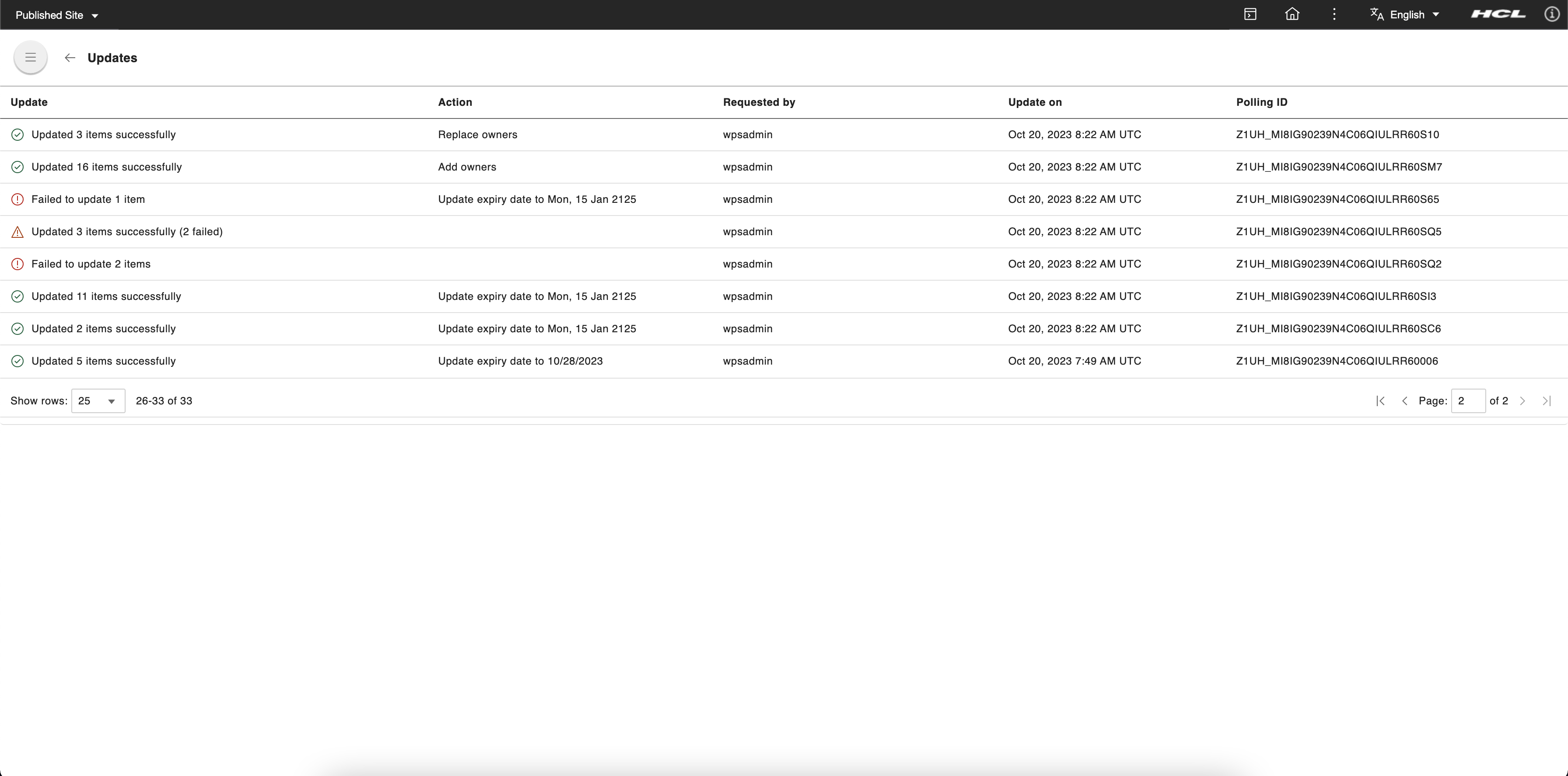 - The bulk updates feature does not have project scope (HCL Digital Experience Projects) capabilities.