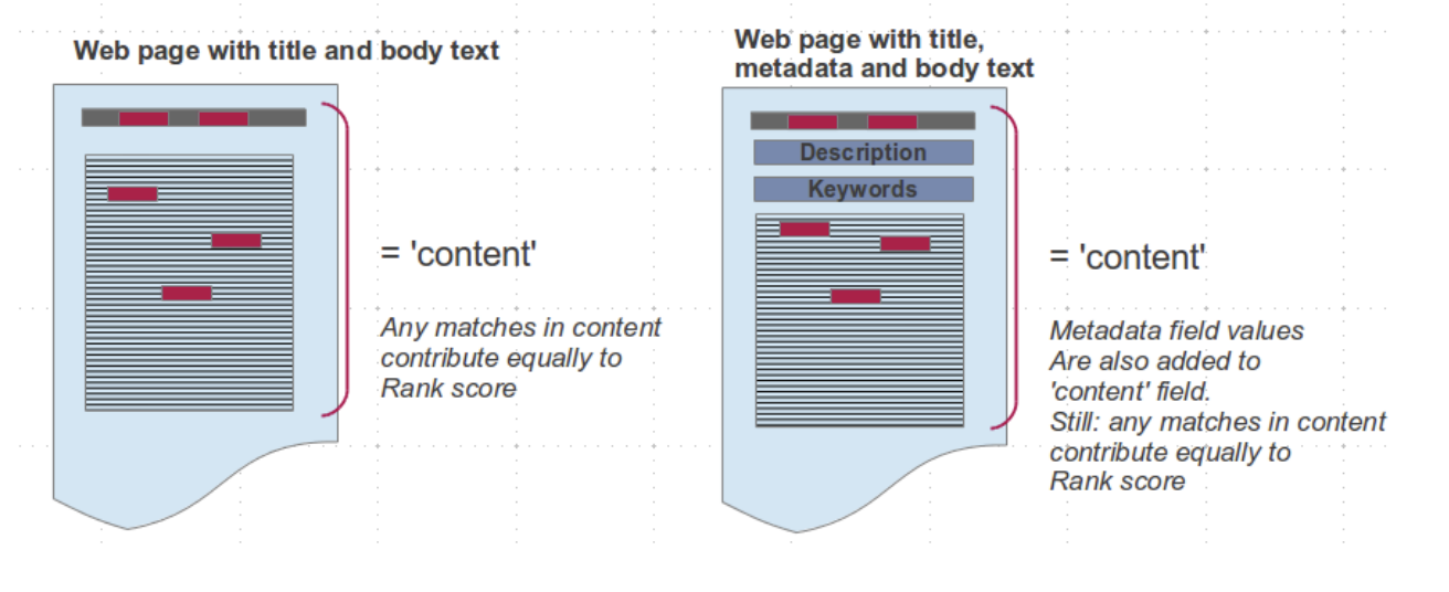 The relevancy calculation does not account for the structural information of the content and the informative weight of keywords stored in individual metadata fields. For example, if a search term appears in the title of a document, its contribution to the relevance score should be higher than an occurrence of that search term somewhere in a sentence in the body text of that document.