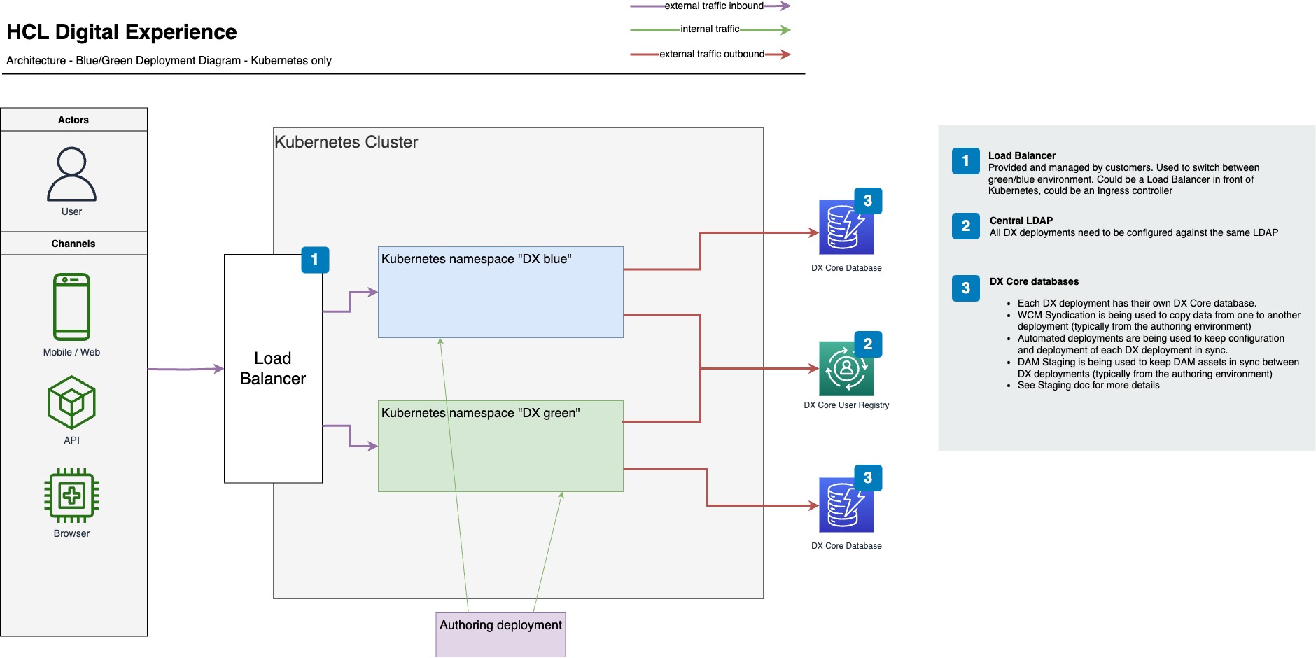 The following diagram outlines how a DX solution could be deployed for high availability and blue/green deployments in a single Kubernetes cluster: