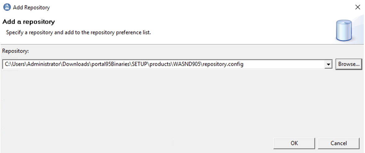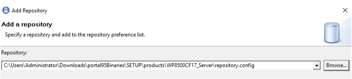 In the next IIM Window, we need to navigate to the repository.config file. Navigate to portal95Binaries\SETUP\products\WASND905 and select the file as shown in the next image: