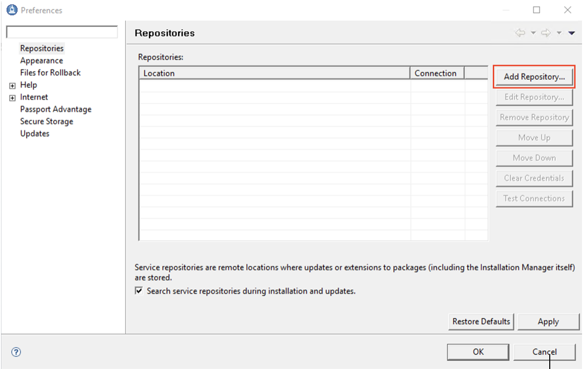Open IBM Installation Manager (IIM) and under File > Preferences > Repositories, add the following repository as shown in the image below:
