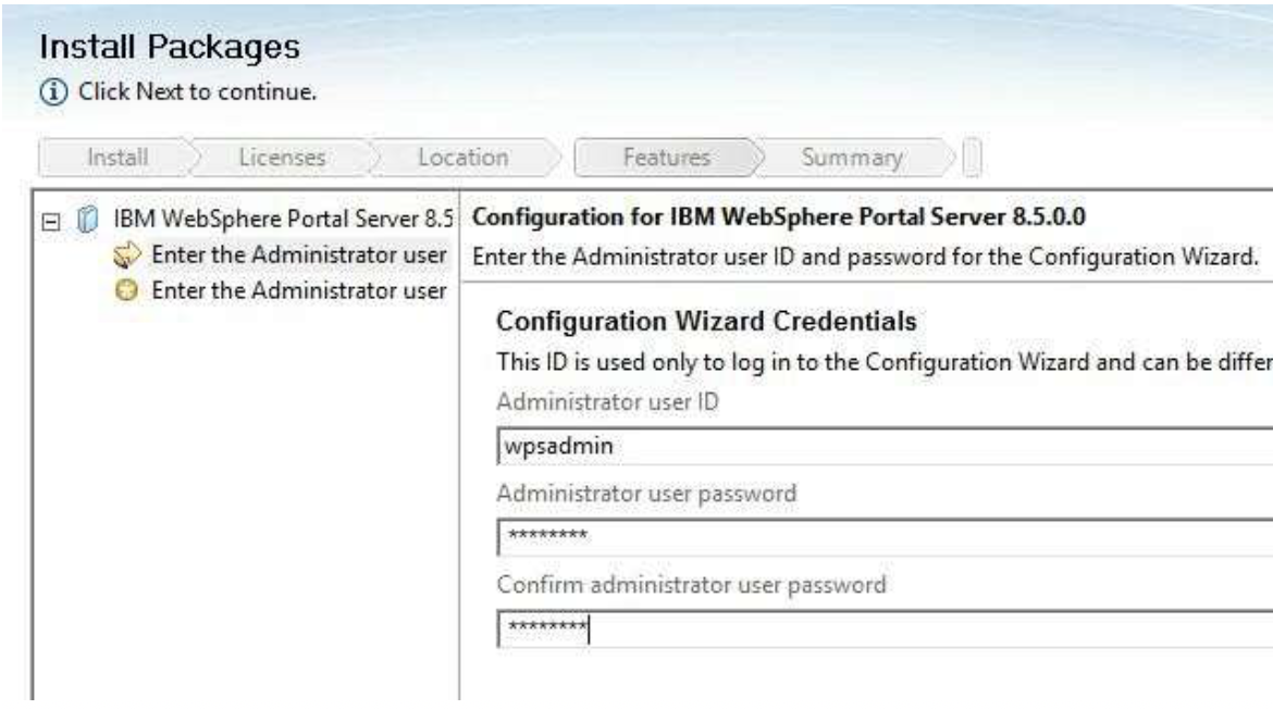 Enter Admin user id and password for WebSphere Application Server and Portal Server. Then select Next.