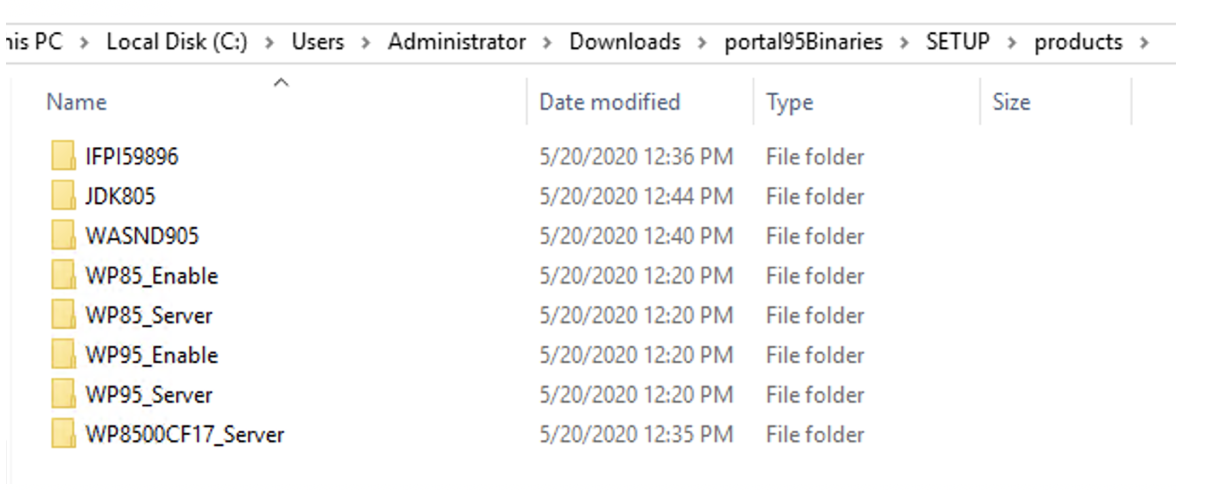 Navigate to the SETUP folder, there should be a Product folder that holds the files and repositories for WAS 9.0.x, JDK 8.0.x, Portal 8.5.0.0, CF17 for Portal 8.5, Portal 9.5, and iFix PI59896.