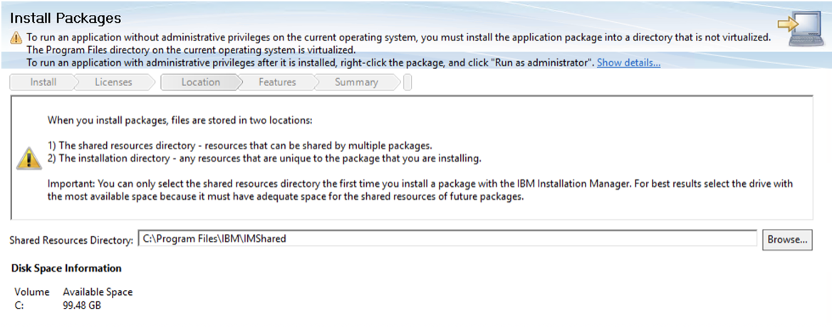 The WebSphere Application Server package installation path will need to be customized as it tries to put it under the Program Files folder by default.
