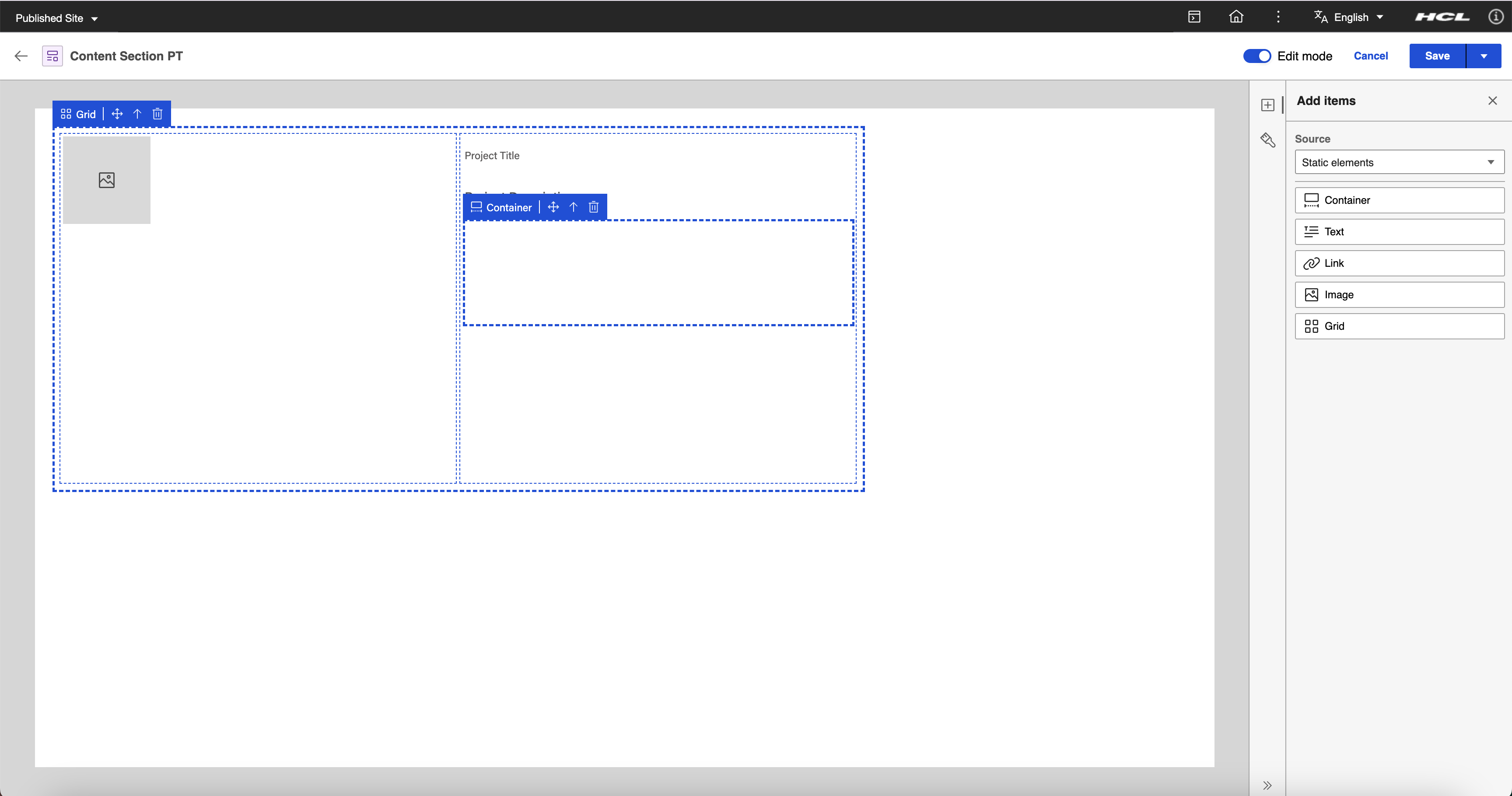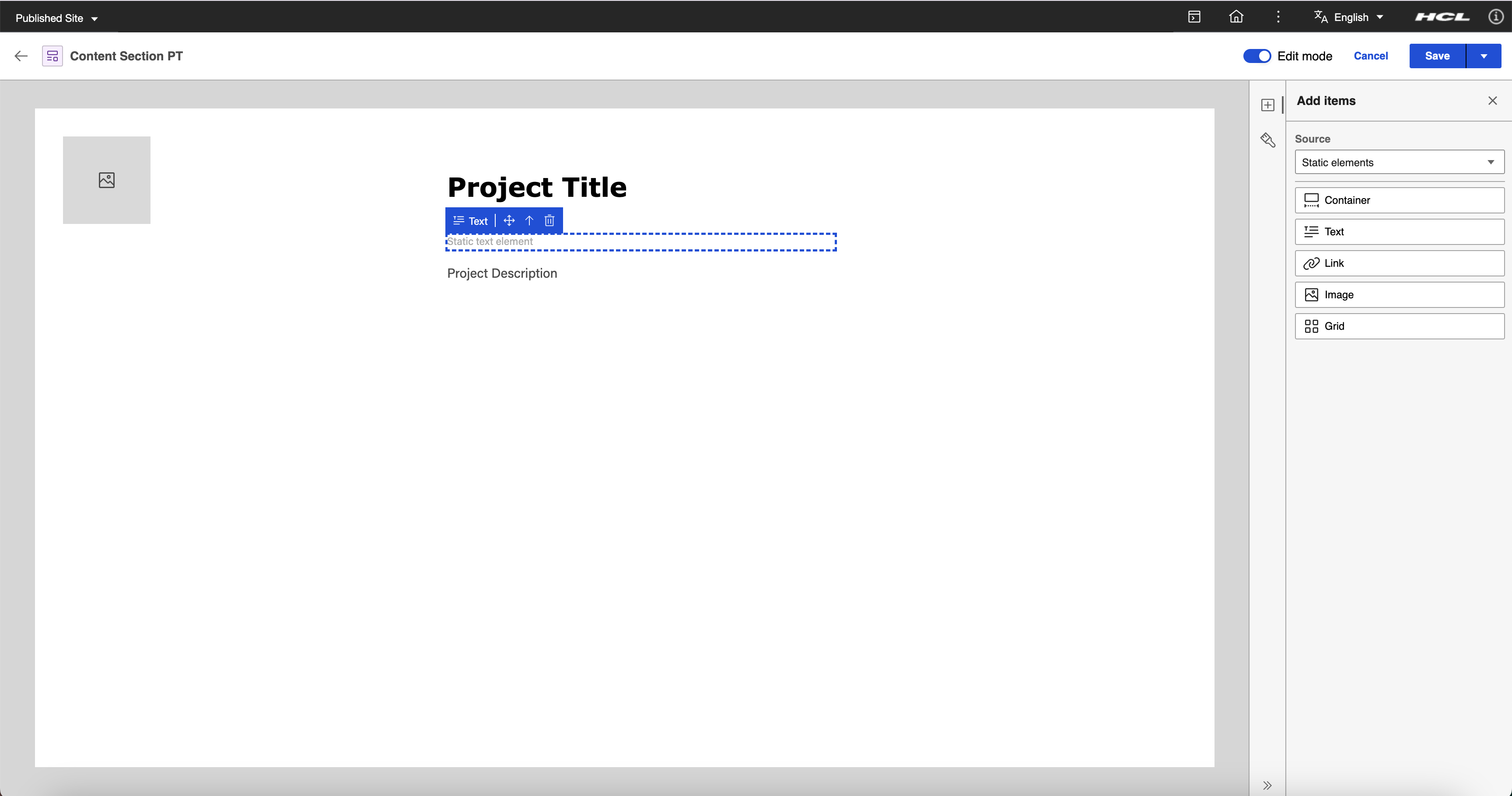Drag and drop the Project Title (Text Content Element) and Project Description (Rich Text Content Element) inside the static container element.