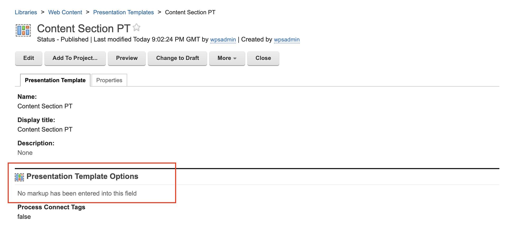 Use the Preview feature from the Authoring portlet to check the presentation template you edited in Presentation Designer.