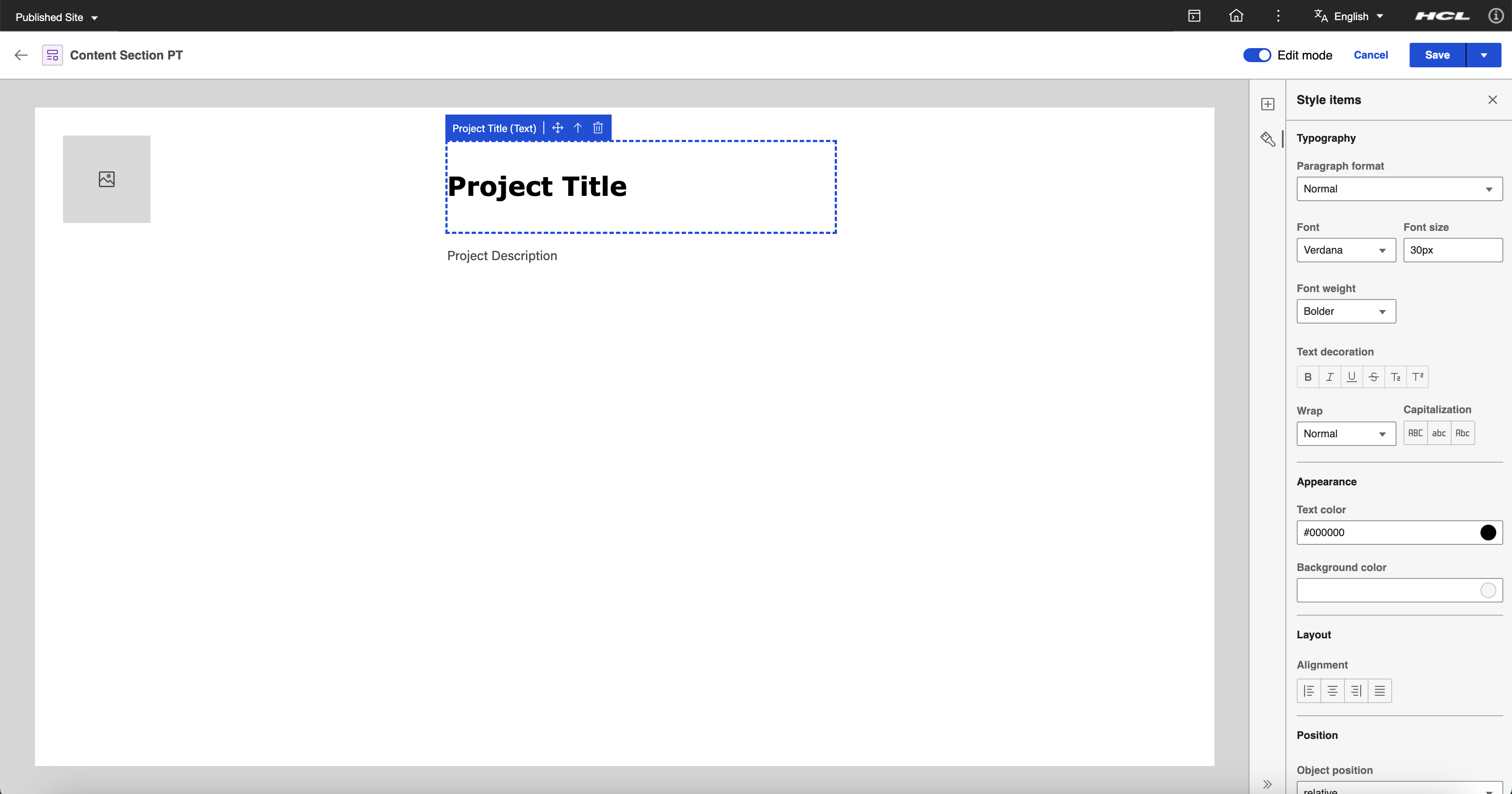 Select the Project Title (Text Content Element) and enter the following values in the Style panel: