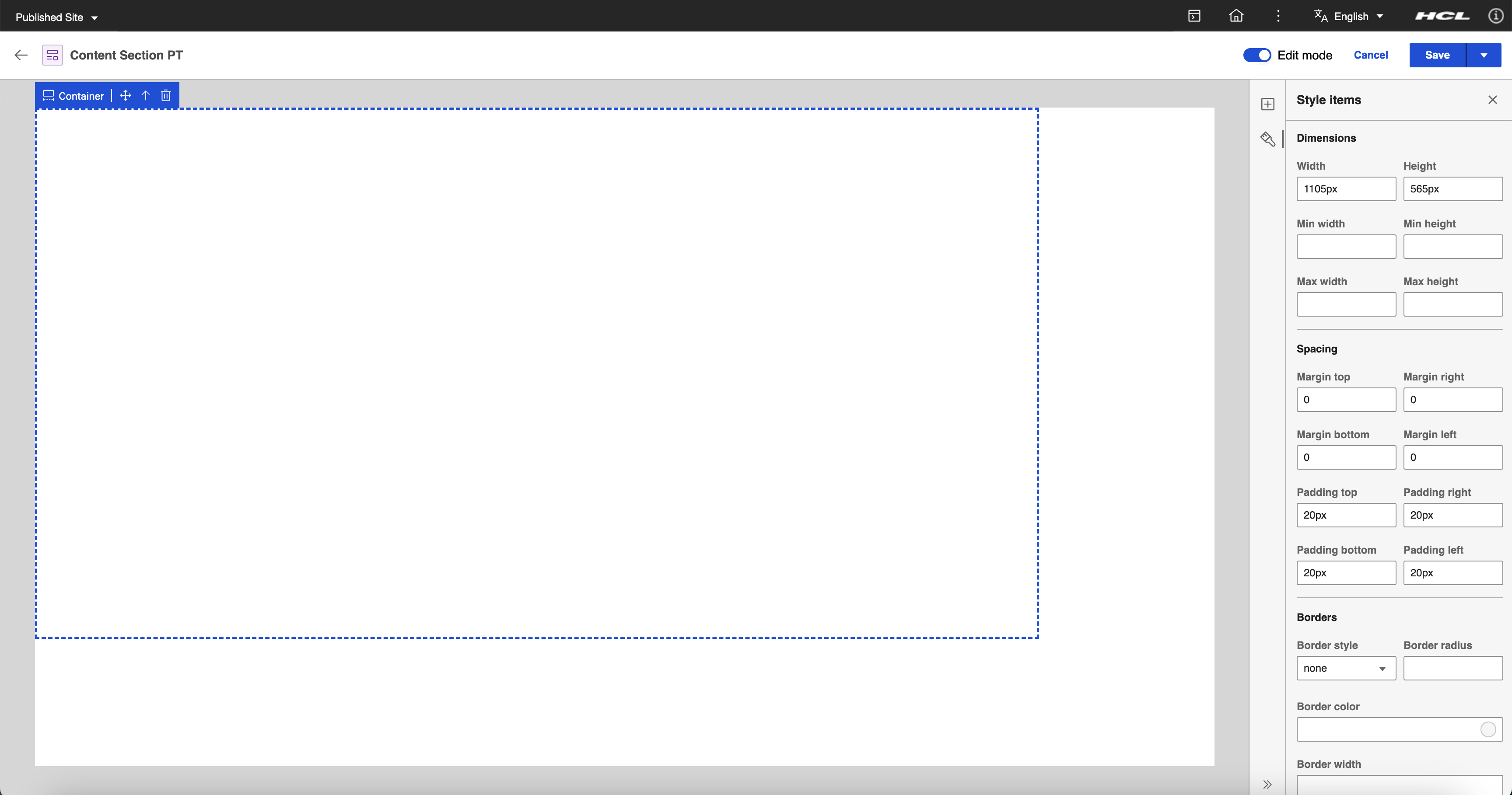 Select the static container element and enter the following values in the Style panel: