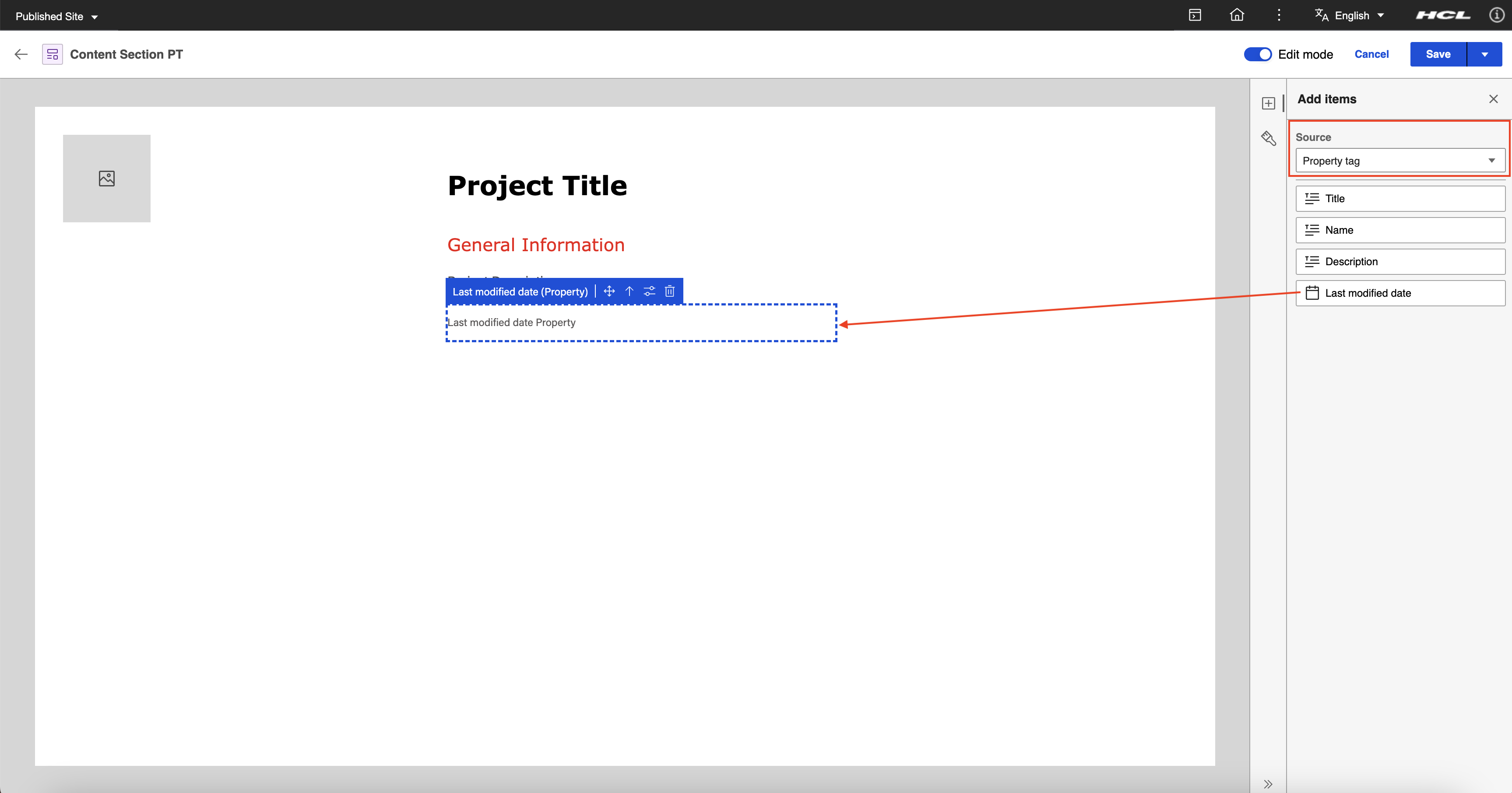 In the Add Items panel, set the element source to Property tag then drag and drop the Last modified date property tag under the Project Description (Rich Text Content Element).