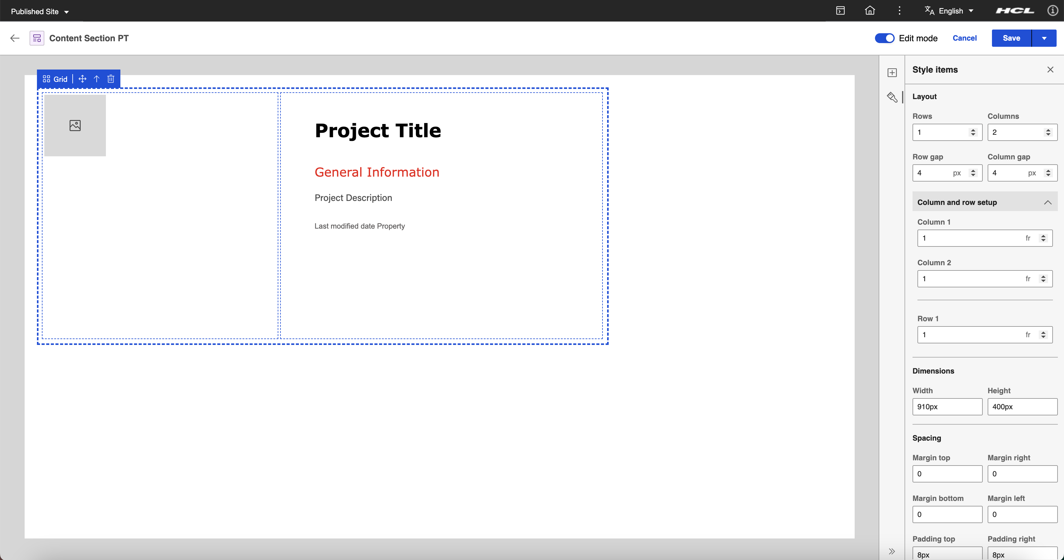 Click the Style panel and enter the following values to create a 1 x 2 grid. The content section template needs a 1 x 2 grid to display an image on the first column and the details on the second column.