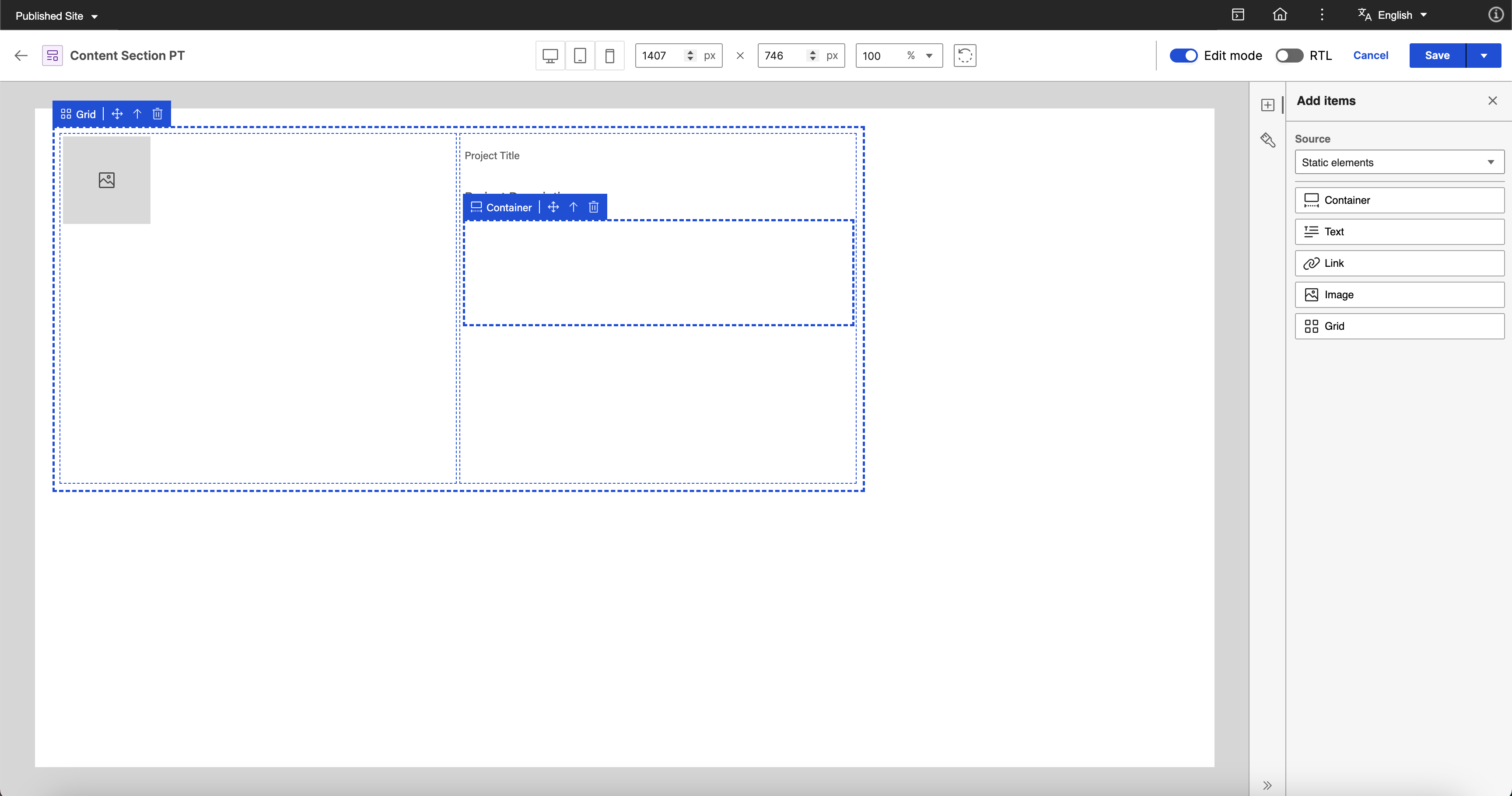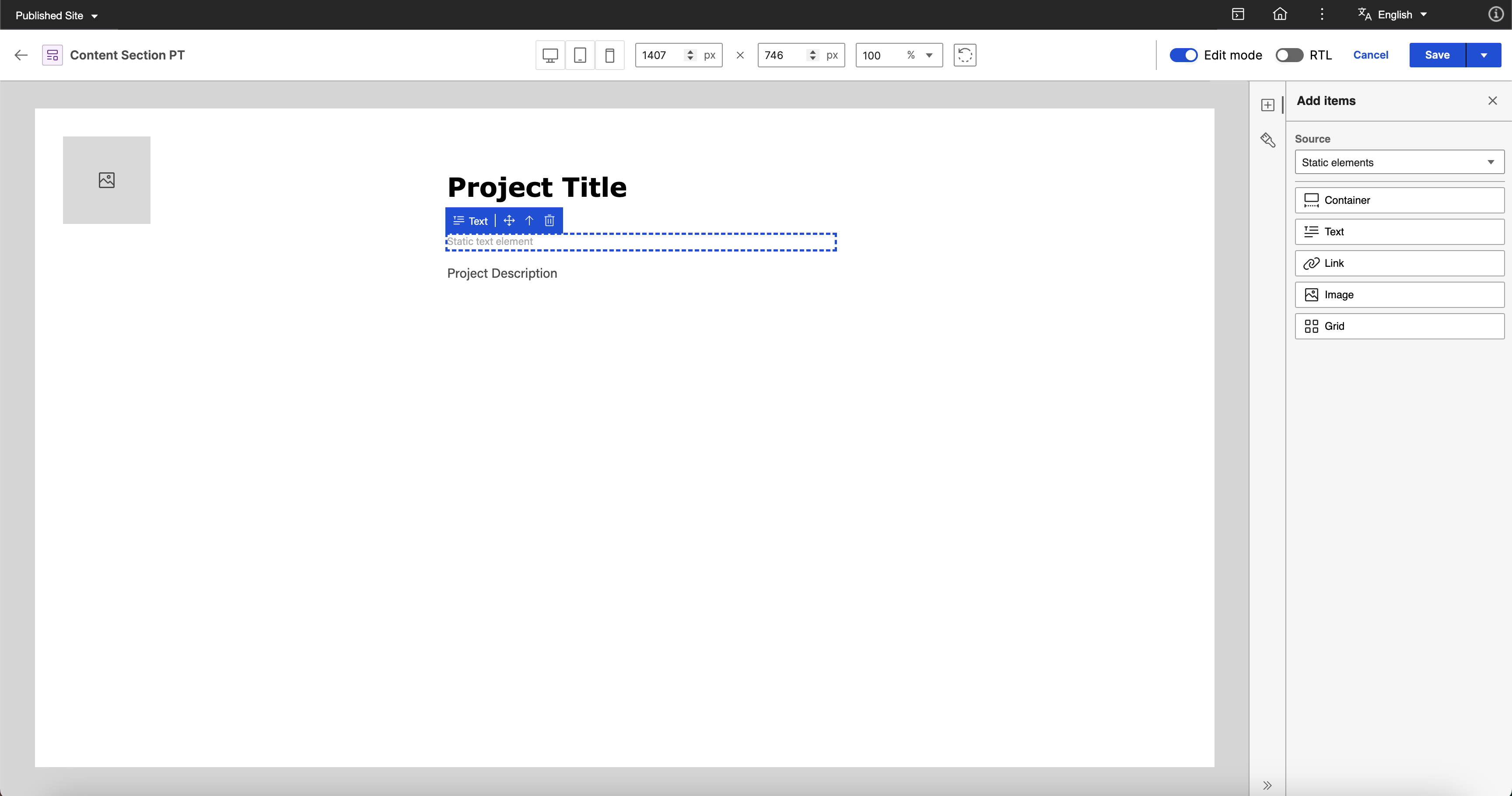 Drag and drop the Project Title (Text Content Element) and Project Description (Rich Text Content Element) inside the static container element.