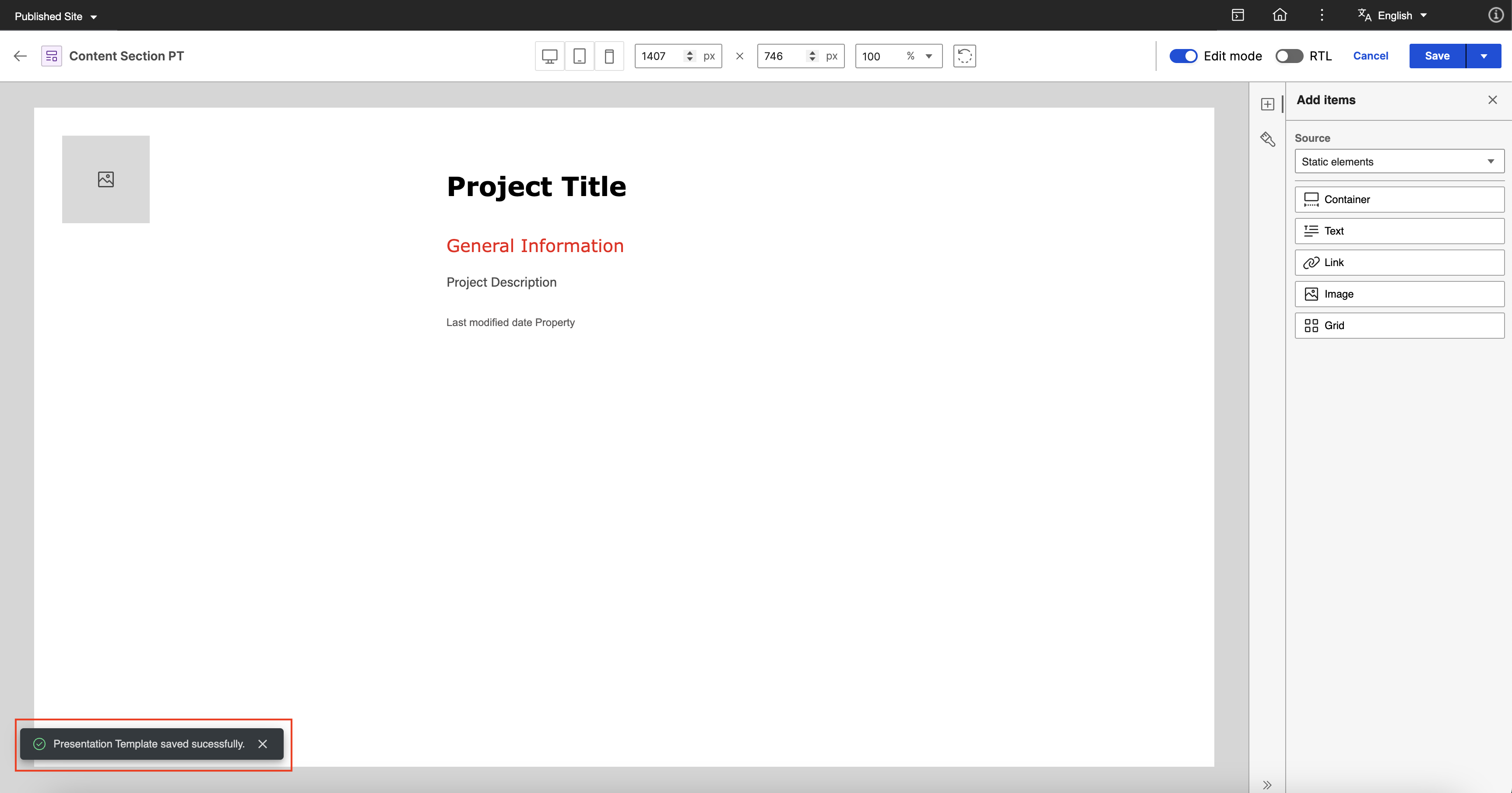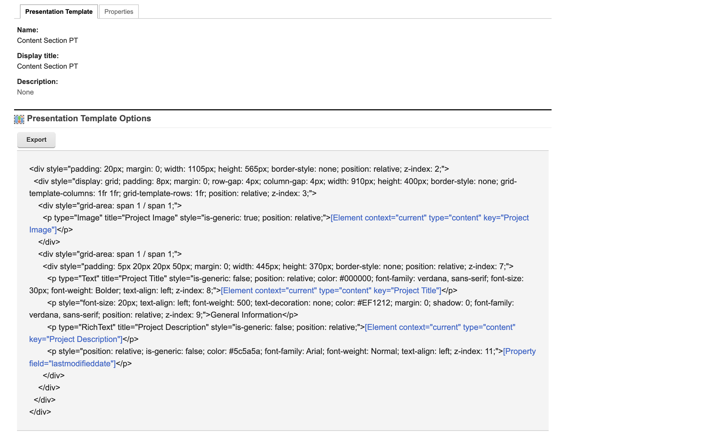 To provide a comprehensive example, the goal is to have a Content Section presentation template for a project page which displays an image of the project, the project title, and general information by utilizing the capabilities of Presentation Designer.