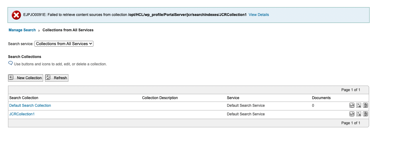Deleted JCRCollection1 and Default Search Collection in Portal > Administration > Search > Search collections.