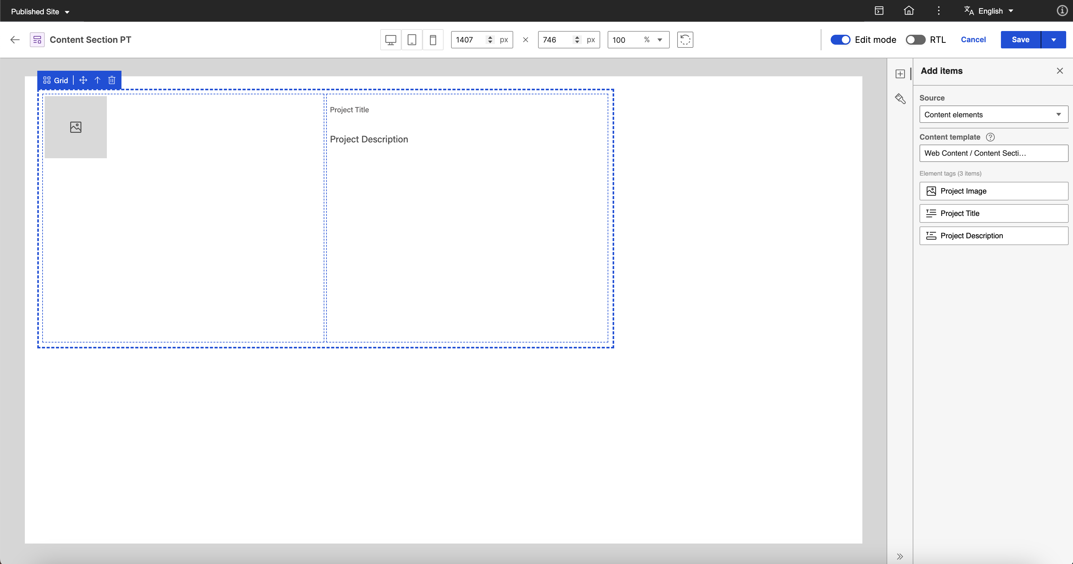 Create a content template with image, text, and rich text elements. The image element is for the Project Image, the text element is for the Project Title, and the rich text element is for the Project Description. For more information on how to create a content template, see Author Content Templates.