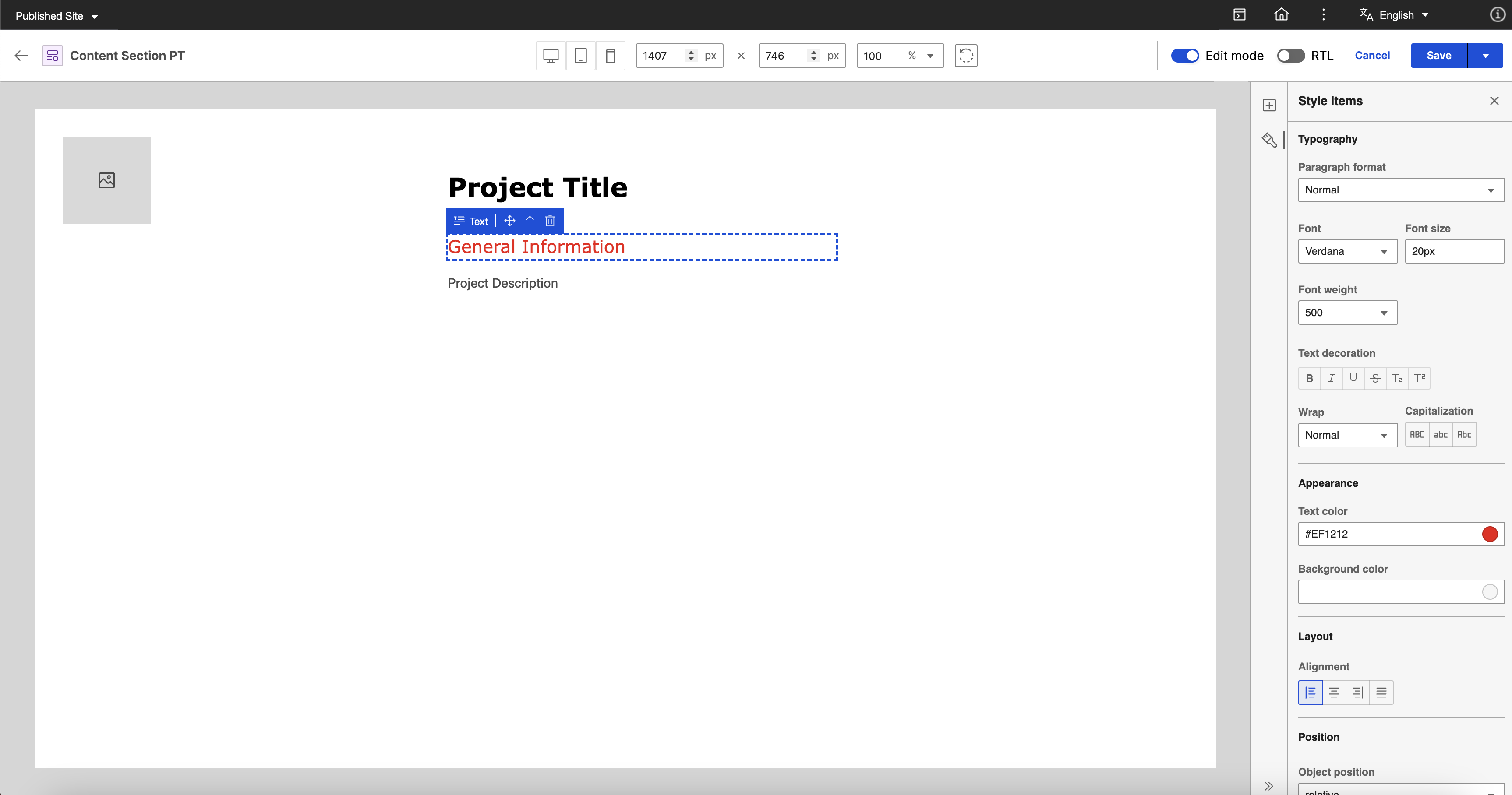Select the Project Title (Text Content Element) and enter the following values in the Style panel: