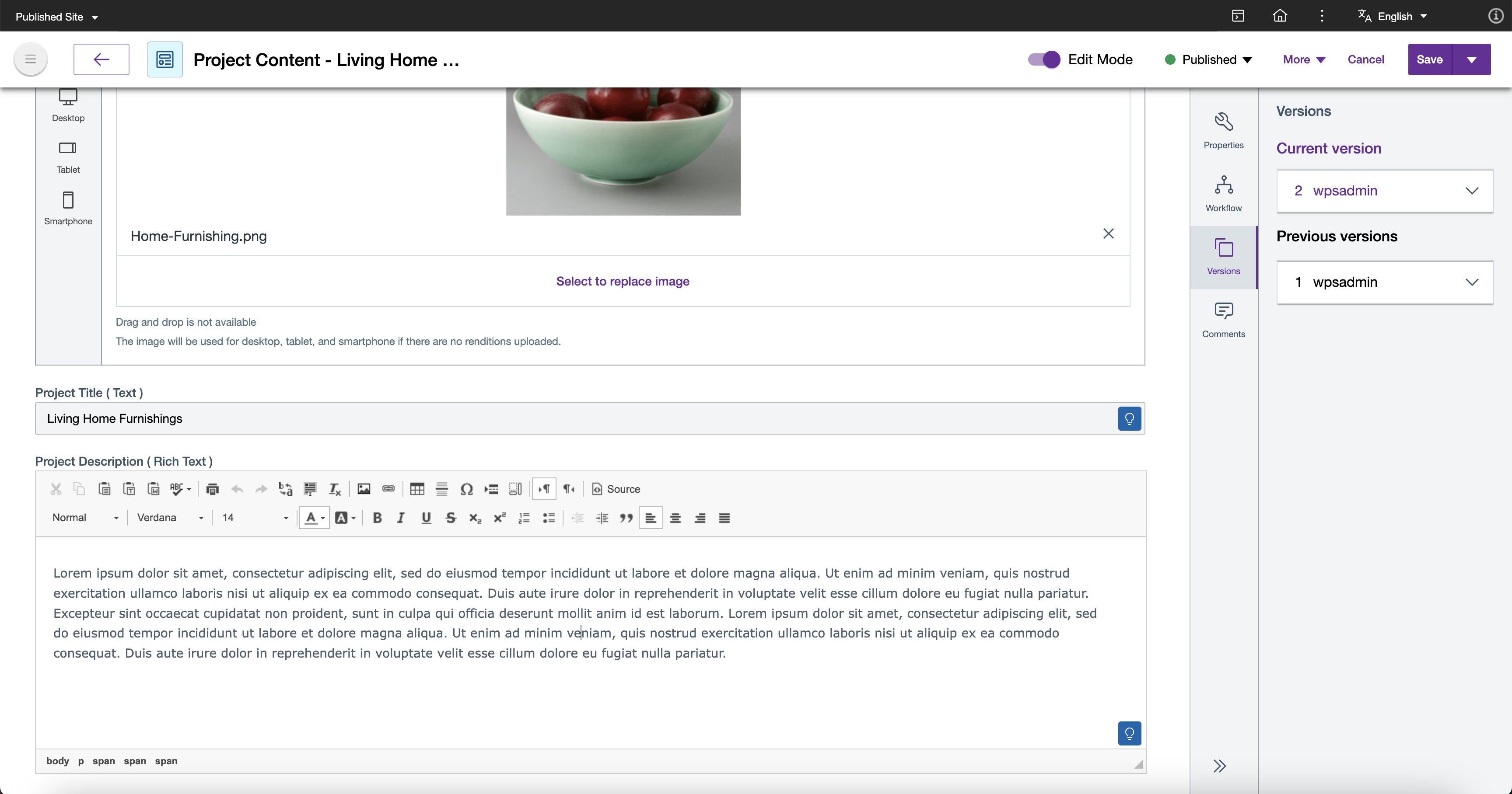 To provide a comprehensive example, the goal is to have a Content Section presentation template for a project page which displays an image of the project, the project title, and general information by utilizing the capabilities of Presentation Designer.