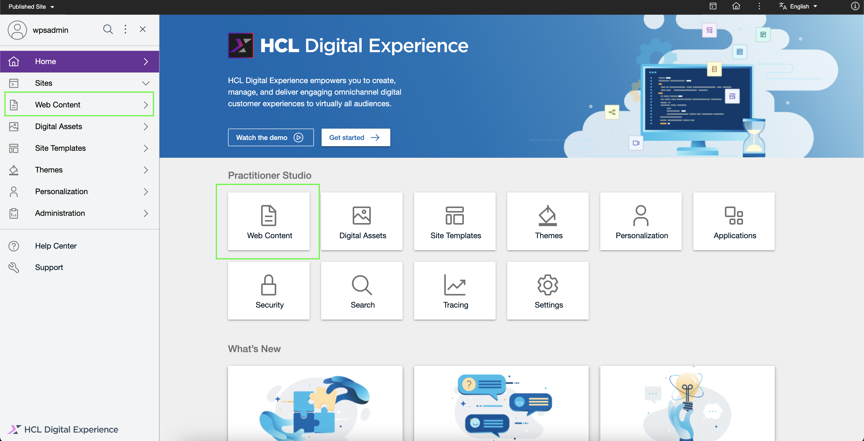 Log in to your HCL DX 9.5 platform then select Web Content from the side navigation panel. Alternatively, you can click the Web Content card from the Practitioner Studio homepage.