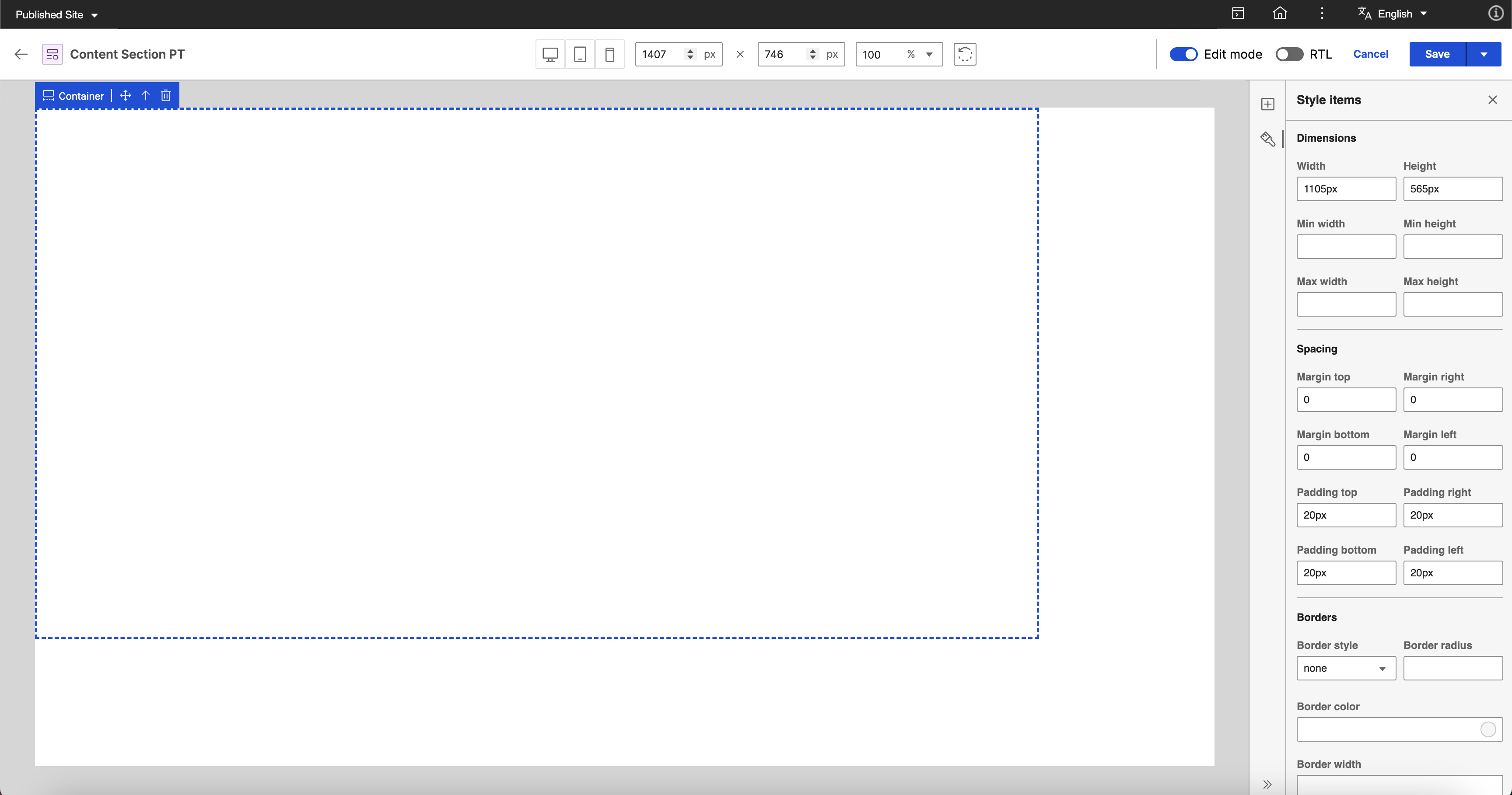 Select the static container element and enter the following values in the Style panel: