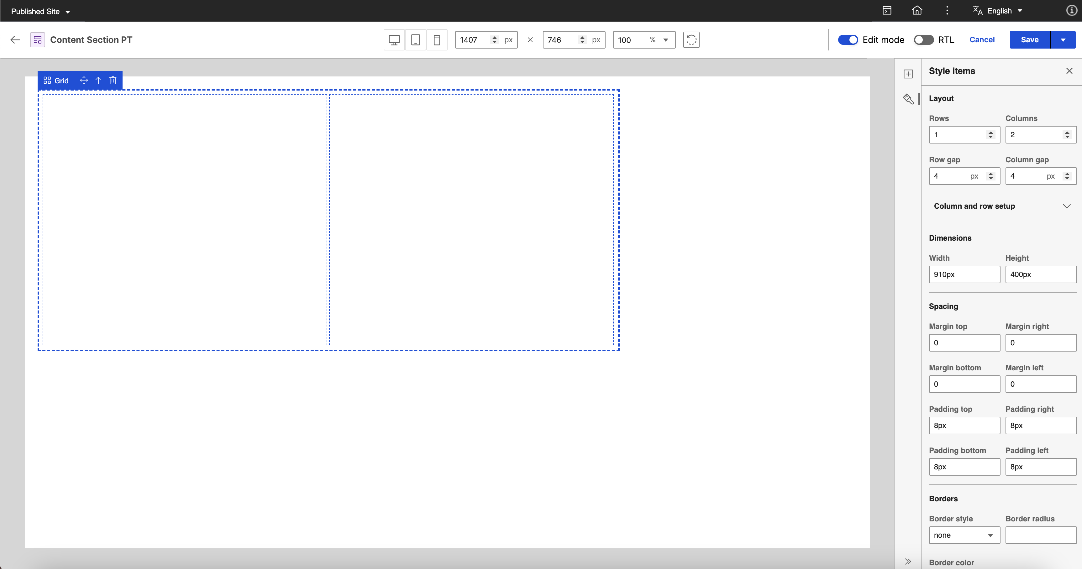 Click the Style panel and enter the following values to create a 1 x 2 grid. The content section template needs a 1 x 2 grid to display an image on the first column and the details on the second column.