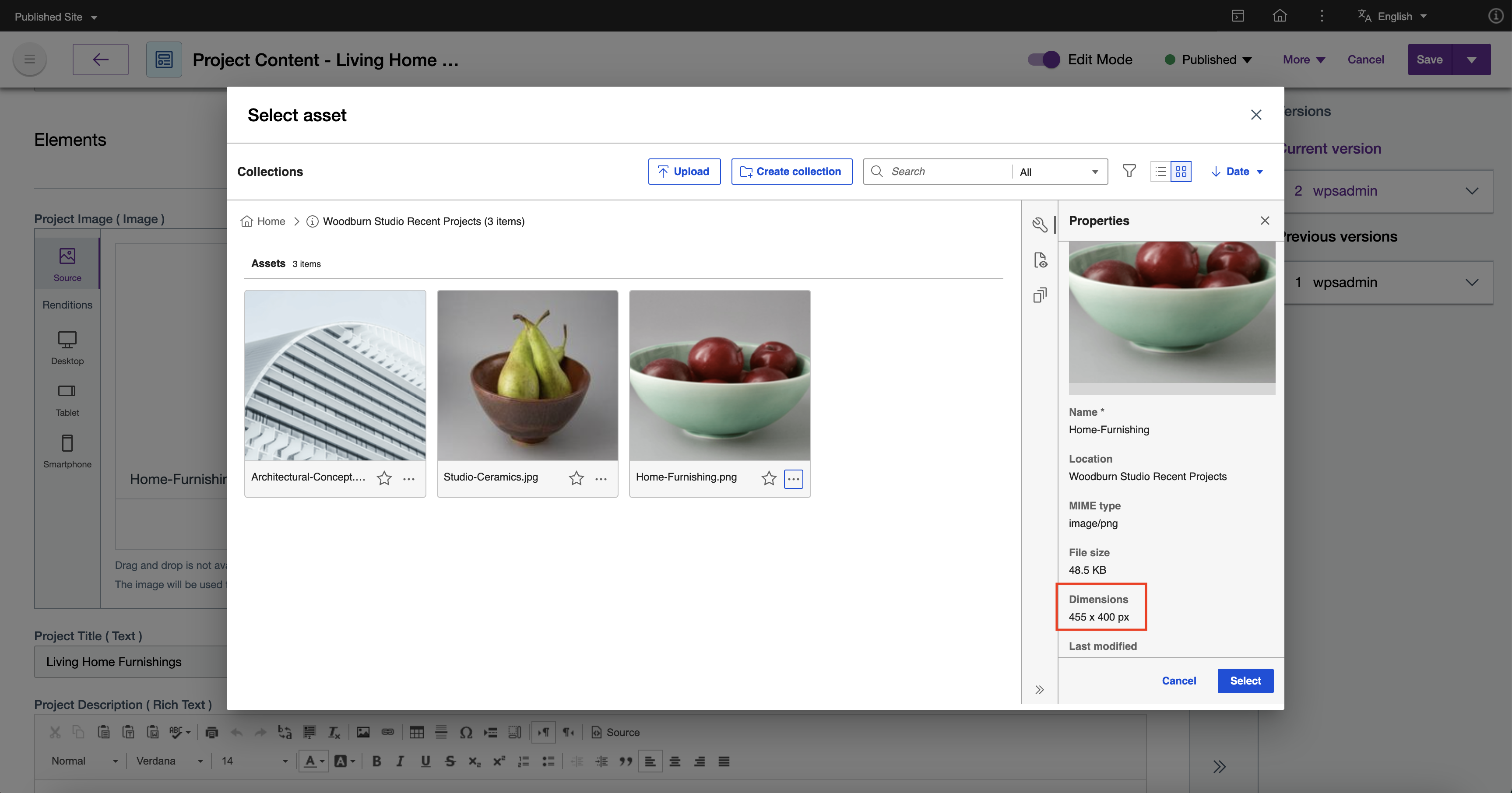 - The Project Image (Image Content Element) in the first column.