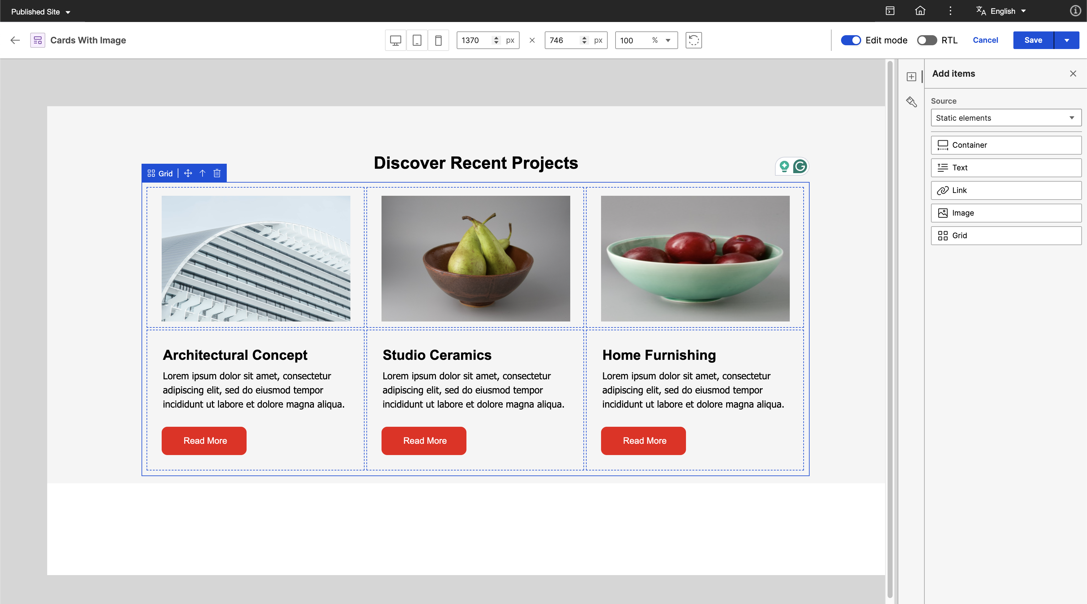 Create a content template with image, text, and rich text elements. The image element is for the Project Image, the text element is for the Project Title, and the rich text element is for the Project Description. For more information on how to create a content template, see Author Content Templates.
