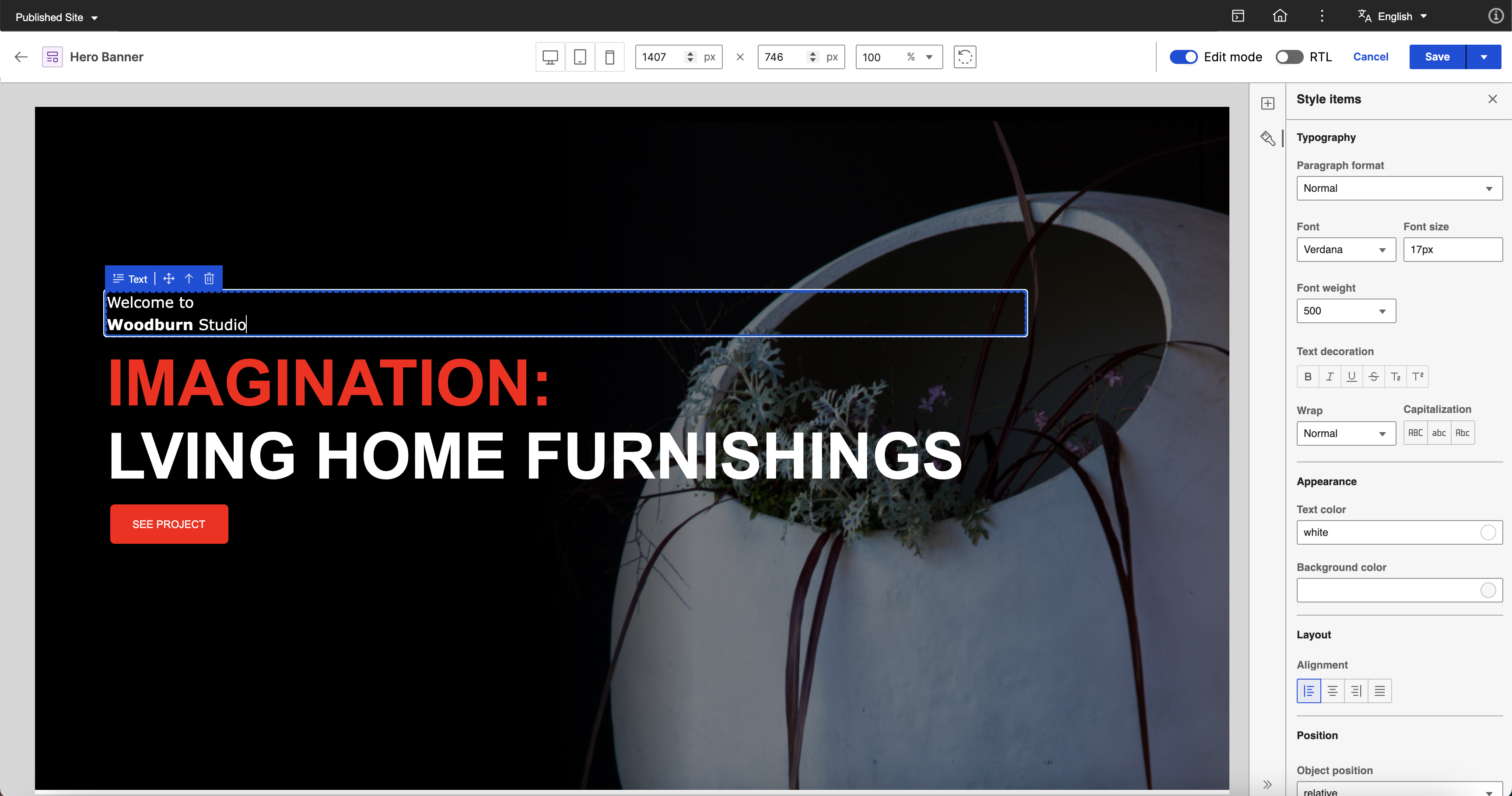 Select the Project Title (Text Content Element) and enter the following values in the Style panel: