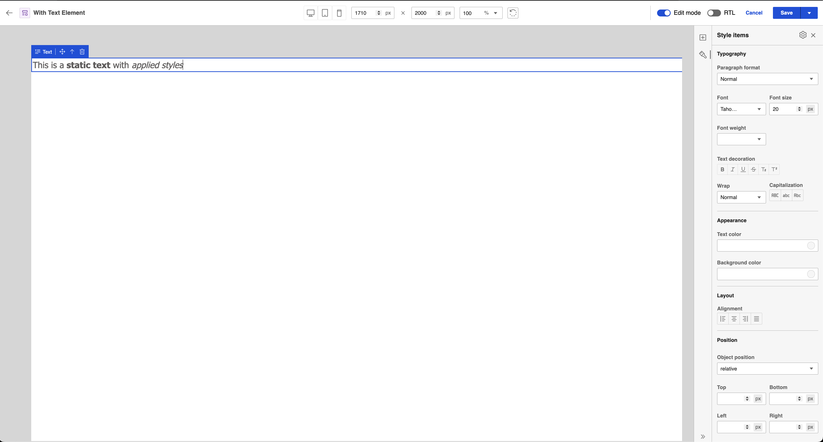 See the following sample static text element with styles applied in Presentation Designer: